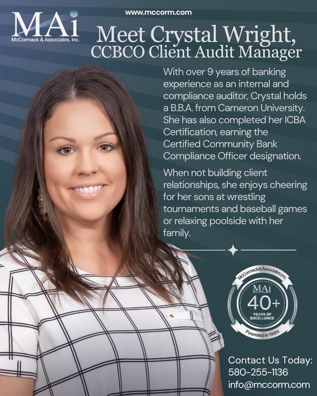 Introducing Crystal Wright, our meticulous guardian of integrity in banking, armed with over nine years as an internal and compliance auditor, a B.B.A. from Cameron University, and her hard-earned ICBA Certified Community Bank Compliance Officer designation. Her sharp eye for detail not only safeguards our operations but also fosters unbreakable client trust through genuine relationship-building.