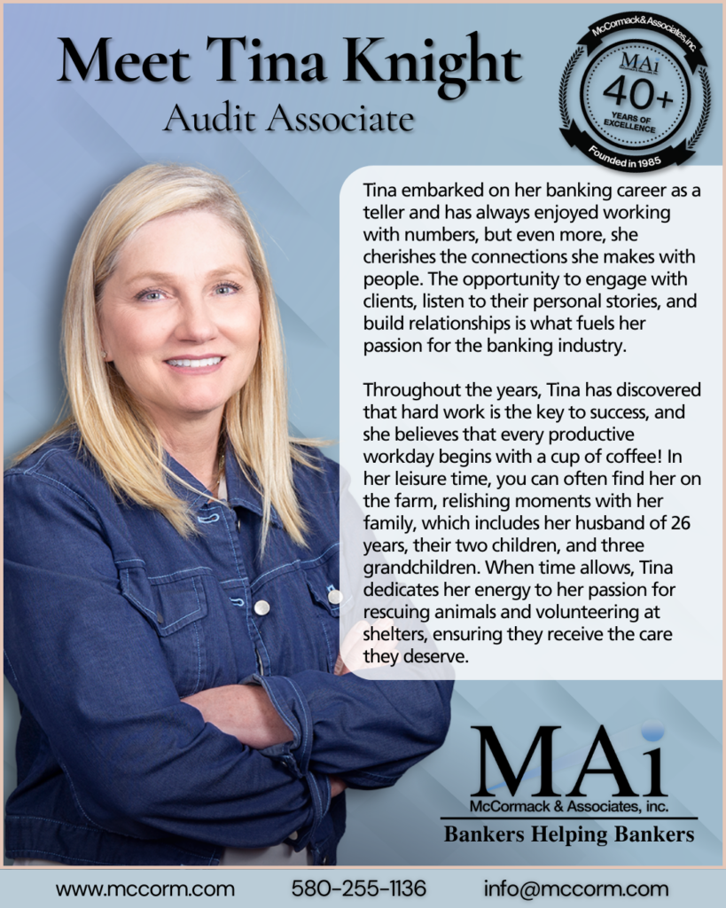 December 5, 2025Tina began her banking career as a teller and has always loved working with numbers—and even more, connecting with people, hearing their stories, and building meaningful client relationships. She believes hard work is the key to success, every great day starts with coffee, and in her free time, she enjoys life on the farm with her husband of 26 years, two children, three grandchildren, and her passion for rescuing animals and volunteering at shelters.